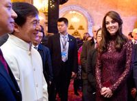 習主席夫妻とウィリアム王子とキャサリン妃は、ランカスター・ハウスで英国の映画、テレビに出演しているスターたちや舞台俳優に会い、イベントに駆け付けたジャッキー・チェンとも対面した。白いカンフー服風のスーツで現れたジャッキーは、習主席夫妻やウィリアム王子夫妻と話を弾ませていたようだ。