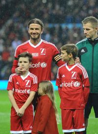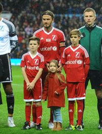 同試合では、父親のデビッドをサポートするために、次男のロメオ、三男のクルスが赤ユニホーム姿で、娘のハーパーは、ジーンズにチェルシーの茶色のレザーブーツ、251ポンド(約4万7000円)のマリーシャンタルの真っ赤なウールコートで参加。観客席からは隔離されたスペースで試合を観賞するために訪れていたヘンリー王子と挨拶する場面があった。