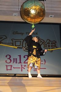 ディズニー/ピクサーの最新作となる本作は、ひとりぼっちの恐竜アーロと少年スポットが織り成すアドベンチャー・ファンタジー。「友達のために、勇気を振り絞って恐怖に打ち勝つこと」がテーマとなることから、りゅうちぇるが約8メートル頭上に設置されたくす玉を割るべく、逆バンジーすることとなった。
