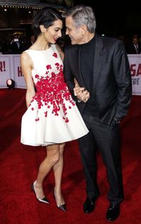 ファッショニスタで知られるアマルは、ヘアをアップにまとめ、ジャンバティスタ・ヴァリの白地に赤い花柄の超ミニスカのドレスで登場。 2014年にヴェネチアで挙式した際にも、アマルは同じデザイナーの白地に花柄のドレスを着ていたが、この時はファッションアイコンとして何を着ても絶賛されていた。しかし 今回は大不評を買っている。