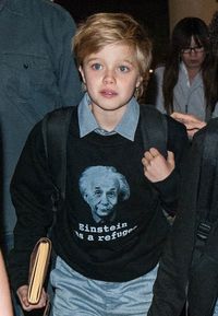 デイリー・メール紙には、ロサンゼルスの空港で撮影されたアンジーと、パックス、ザハラ、そしてシャイロの写真が掲載されているが、シャイロが着ていたトレーナーの前面には、「Einstein was a refugee」(アインシュタインは難民だった)というメッセージとアインシュタインの顔がプリントされている。