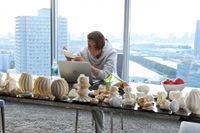 二枚目は、部屋で楽しげに“幾何学折り紙”を折りながら、パソコンを眺める紫苑。机には、さまざまな形の完成した幾何学折り紙が!幾何学折り紙とは、完成形を想像し、展開図の設計を行い、一枚の紙のみで作る折り紙で、想像力と果てしなく緻密な計算が必要だという。