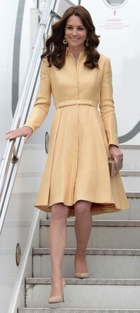 インドからブータンを訪れたキャサリン妃は、2012年にも着ていたカスタムメイドのエミリア・ウィックステッドのバターイエローの推定1200ポンド(約19万2000円)のコートドレス、L.K.ベネットのパンプスが195ポンド(約3万円)という姿で登場。