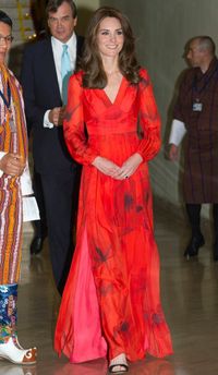 その後のレセプションでは、ブータンの国花であるブルーポピーがあしらわれた745ポンド(約12万円)の赤いビウラのドレスと、3度目となるジャンビトロッシの黒いスウェードで、総額は1854ポンド(約30万円)だった。
