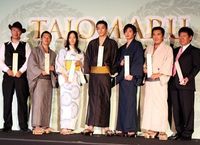 登壇したのは、小栗旬、柴本幸、田中圭、やべきょうすけ、松方弘樹、中野裕之監督、山本又一郎プロデューサーの7名。七夕が近いということで、キャストは全員浴衣姿で登壇した。
