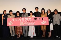 八田鮎子の人気少女コミックを映画化した『オオカミ少女と黒王子』の初日舞台挨拶が5月28日に新宿ピカデリーで開催され、二階堂ふみ、山崎賢人、鈴木伸之、門脇麦、池田エライザ、玉城ティナ、吉沢亮、菜々緒、廣木隆一監督が登壇。劇中で菜々緒からビンタをされた山崎が「イタ気持ちよかった。初めてが菜々緒さんでよかった」とドM発言を放ち、会場を沸かせた。