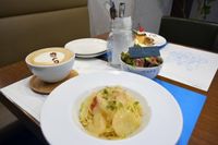 『時をかける少女』より「真琴が届けてくれた桃をふんだんに使った 桃とトマトの冷製パスタ ※時かけカフェ限定サラダボウル付」¥1680(税込)