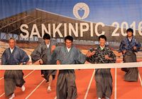 2014年にスマッシュヒットを記録した歴史エンタテインメントの続編『超高速!参勤交代 リターンズ』(9月10日公開)のスペシャルセレモニーが8月3日に都内で開催され、佐々木蔵之介、深田恭子、伊原剛志、寺脇康文、上地雄輔、知念侑李(Hey! Say! JUMP)、柄本時生、六角精児、中尾明慶、富田靖子、陣内孝則、西村雅彦、本木克英監督、猿の菊千代がズラリと登壇。“SANKINPIC 2016”と題して、男性陣が徒競走にチャレンジ。1位となった伊原が、深田にご褒美のキスをおねだりをした。