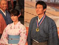 劇中で走って参勤交代することにちなみ、この日は会場に7メートルの陸上トラック風カーペット敷かれ、男性陣が“超短距離”ながら猛ダッシュを披露した。見事、1位となった伊原は、深田から金メダルを授与されることになると、深田の肩を抱いてキスをおねだり。深田がのけぞるように伊原からのキスを阻止すると、会場も大爆笑だった。