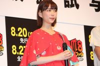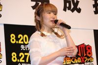 鷹の爪10周年記念作品『鷹の爪8 〜吉田くんの×(バッテン)ファイル〜』の完成披露試写会が、8月7日に新宿明治安田生命ホールで開催され、声優を務めた森川葵、内田彩、モン吉、監督のFROGMANが登壇。それぞれの怪奇現象体験をクロストーク中に、突然、箕輪はるか(ハリセンボン)がサプライズ登場すると、森川や内田たちは驚いて目を丸くした。
