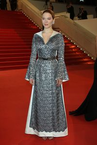 ショートヘアに、トレードマークの赤い口紅はセクシーだが、黒いシンプルなドレスに、紺のゆったりとしたラウンドネックのブラウスと、今回は全く露出のないファッションでレッドカーペットを歩いたレア。