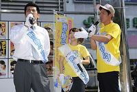 今回、ゴリ監督を“代表”にした“自由フリムン党”という政党(?)を結成。政党らしく、自転車に乗って“エコ”をアピールしながら登壇したゴリ代表は、新宿アルタ前の小会場で熱弁を奮った。