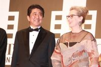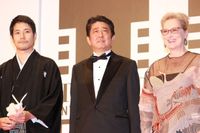 安倍総理は「難病と戦った棋士、村山聖さんを20kgも体重を増やして演じた松山さん、羽生善治さんの1つ1つの仕草まで研究し、魂がのりうつったような東出さんの名演技を楽しんでいただきたい。また、世界の名女優のメリル・ストリープさんにもお越しいただきありがとうございました」と3人を称えた。