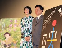 第29回東京国際映画祭特別招待作品『この世界の片隅に』の舞台挨拶が10月28日にTOHOシネマズ六本木ヒルズで開催され、片渕須直監督とのんが登壇。片渕監督から「完成度が高く、最もナチュラルに存在していた。僕は彼女のことが誇らしいです」と声の演技を絶賛されたのんが、愛らしいハニカミ笑顔を見せた。