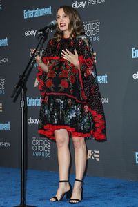 『ジャッキー/ファーストレディ 最後の使命』(2017年春公開)でジョン・F・ケネディ元大統領の妻ジャクリーン・ケネディ・オナシスを演じ、放送映画批評家協会賞の主演女優賞を受賞したナタリー・ポートマンが、黒地に赤い花がプリントされた三段重ねでケープらしき形状のドレスを着て登場。お腹の膨らみをカバーするデザインは妊婦ドレスとしては優れているが、奇抜な形のドレスだけに、ファッションとしてはどうなのかと首をひねる人々もいるようだ。