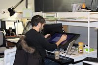 現場の生の声を聞いてみよう。約70台のペンタブレットが用意され、もくもくとタブレットに向かっている強力スタッフ陣。レイアウト作画監督の末澤慧さんと、原画作画監督の辻智子さんは「リズム感がつかみやすい」と声をそろえる。二人にとって今回が初めてのデジタル作画だ。末澤さんは「プレビューができるので、描きながら動きがチェックできるのはいいですね。動きを考える上でも刺激になっています」。また“絵コンテ”が、動きや声もつけることができる“ビデオコンテ”となったことで、「五里霧中じゃない。この声だから、こういう表情だろうという想像がクリアになった」とも。監督のイメージがスタッフにも共通認識として伝わりやすくなっていた。
