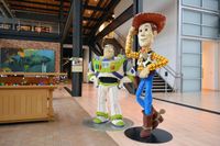 受付では『トイ・ストーリー』のウッディ&バズがお出迎え。右手には、アカデミー賞のほか映画賞のトロフィーがずらりと並ぶ。吹き抜けのロビーはかなり開放的で、とにかく天井が高い! ミーティングスペースの展示は時期によって変わるそうで、この日は『ファインディング・ドリー』のコンセプトアートが飾られていた。