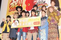 2 大スーパー戦隊が競演する『劇場版 動物戦隊ジュウオウジャーVS ニンニンジャー 未来からのメッセージ from スーパー戦隊』(1月14日公開)の完成披露上映会が、1月8日に丸の内TOEIで開催。中尾暢樹や西川俊介ら人気キャストが、今年の干支の酉にちなみ、ニワトリの風船を手に登場し、名乗りを披露した。