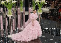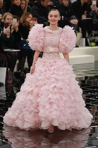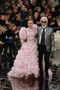 昨年12月に続いて、シャネルのランウェイでラストルックを飾ったリリーは、ぴったり七三に分けたヘアスタイルに、クリエイティブ・ディレクターのカール・ラガーフェルドが手掛けたシュガーピンクのウェディングドレスを着て、カールと共にランウェイを歩いた。